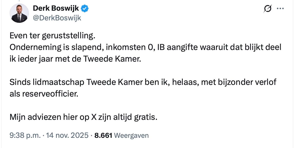 Daarnaast zit hij met zijn ouders nog in vennootschap Firma A. Koorevaar den Besten. In beide functies is hij nog actief en beide functies zijn bezoldigd - alleen staat er geen bedrag bij. Hoe het ook zij: als Kamerlid moet hij dus beslissingen nemen die een directe invloed kunnen hebben op zijn eigen bedrijfsresultaten.