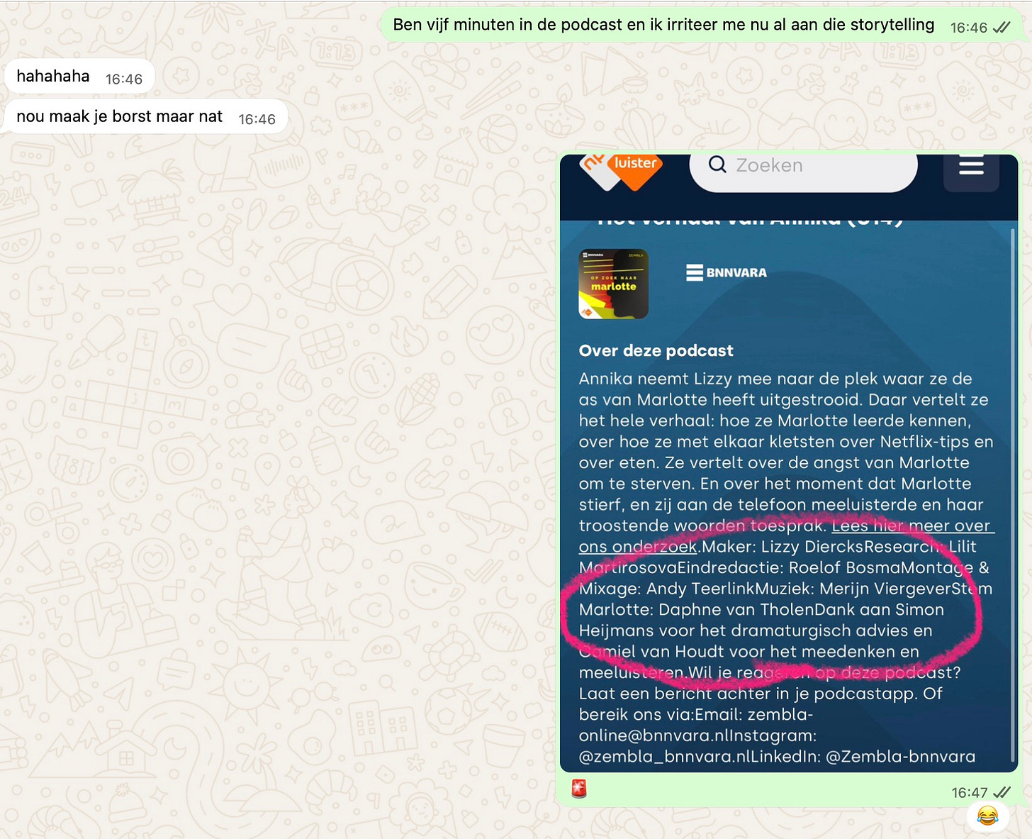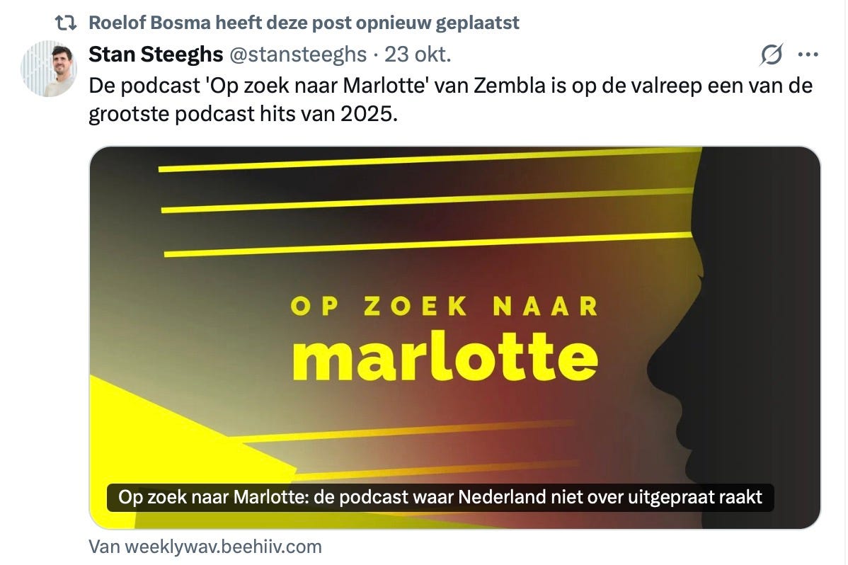 Voor degenen die de laatste podcast-hit van de publieke omroep hebben gemist: Op zoek naar Marlotte is een vijfdelige podcast van BNNVARA/Zembla gemaakt door journalist Lizzy Diercks en onder eindredactie van Roelof Bosma. De serie volgt de zaak van Annika, een jonge medewerkster van de Kindertelefoon die online contact krijgt met ‘Marlotte’. Maandenlang is de redactie op zoek naar Marlotte om er uit eindelijk achter te komen dat ze helemaal niet blijkt te bestaan.