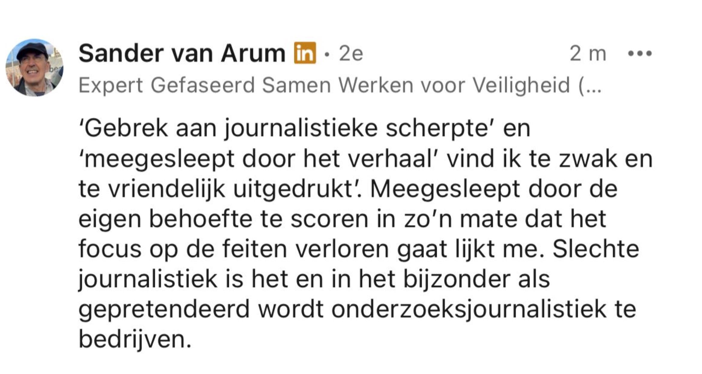 Blijkbaar mag het ook de nodige belastingcenten kosten: een heel team van onderzoeksjournalisten was maandenlang bezig een verhaal te onderzoeken wat met een paar belletjes kapotgecheckt had kunnen worden. Dat je bronmateriaal bestaat uit ‘duizenden pagina’s’ is geen excuus: voor je überhaupt aan de slag gaat (je kunt ook gewoon beginnen met een steekproef?) check je eerst de bron van het materiaal, dan het materiaal zelf en daarna de inhoud van het materiaal. Dit verhaal was bij de eerste twee checks al omgekukeld.