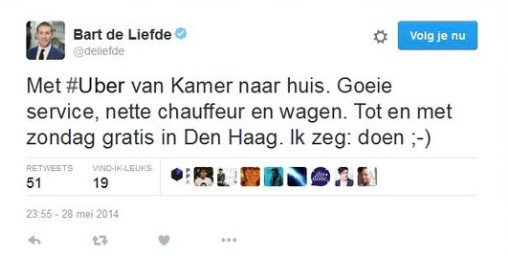In diezelfde tijd stapte VVD-Kamerlid Bart de Liefde over naar taxibedrijf Uber om er als lobbyist aan de slag te gaan. Als woordvoerder mededinging had hij eerder in de Tweede Kamer een lans gebroken voor het Amerikaanse bedrijf: ‘Ik zou graag van de minister de bevestiging horen dat in Nederland een verbod van Uber op lokaal niveau niet mogelijk is.’ Ook maakte hij op Twitter reclame voor Uber-taxi’s: ‘Met Uber van Kamer naar huis. Goede service, nette chauffeur en wagen. Tot en met zondag gratis in Den Haag. Ik zeg: doen ;-)’