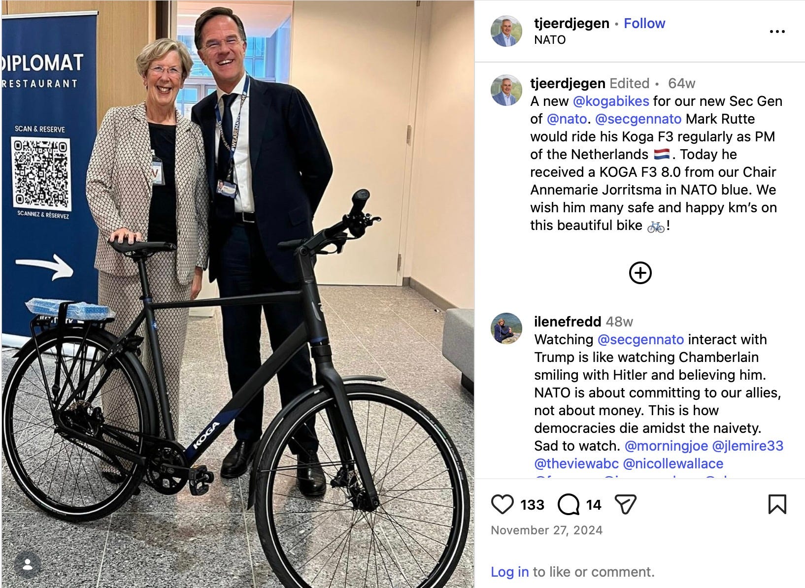 In geen enkel media-optreden wordt melding gemaakt van één van de acht bestuurs-taartjes waar Jorritsma momenteel met haar vingers in zit. Haar netwerk als ‘VVD-prominent’ komt desalniettemin goed van pas in haar bestuurlijke werkzaamheden. In De Telegraaf viel in november 2024 bijvoorbeeld te lezen hoe ‘Annemarie Jorritsma, VVD-prominent en president-commissaris van de Nederlandse fietsenfabrikant Accell, de gloednieuwe Koga F3 8.0 persoonlijk kwam afleveren bij Mark Rutte op het NAVO-hoofdkwartier in Brussel’. Accell-topman Tjeerd Jegen was in zijn nopjes met deze sluikreclame en deelde een foto van de overhandiging trots op Instagram. Het was niet Ruttes eerste Koga F, aldus de krant die het schaamteloze lobbytripje optekende als een vrolijk nieuwsitem. De kleur van de fiets? NAVO-blauw!